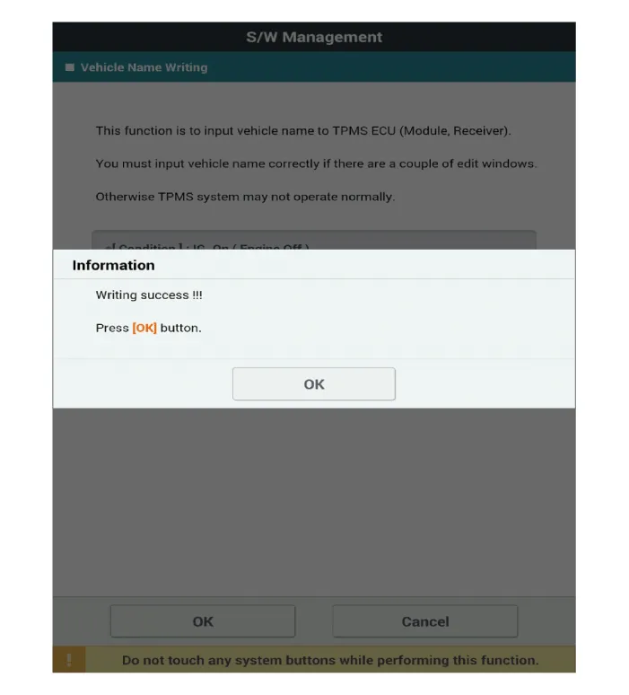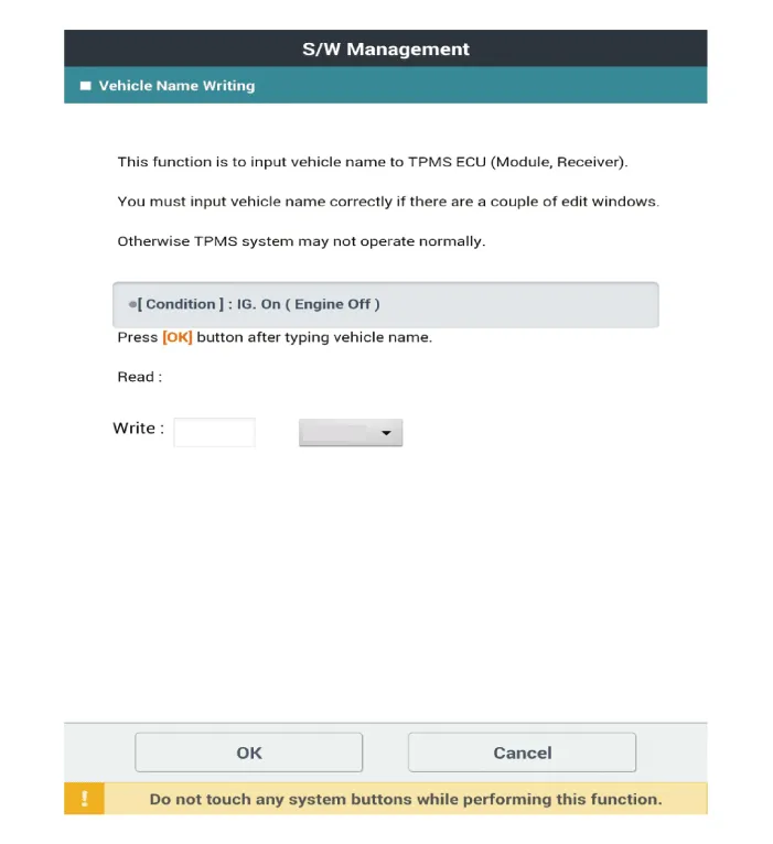 Select the "IBU-TPMS" and "Vehicle Name Writing" on KDS vehicle selection screen, then select OK.