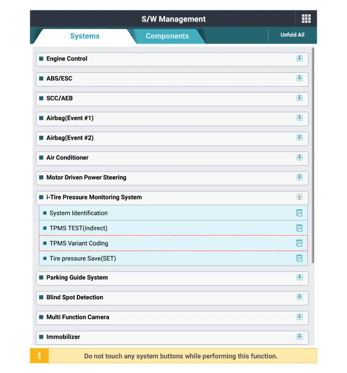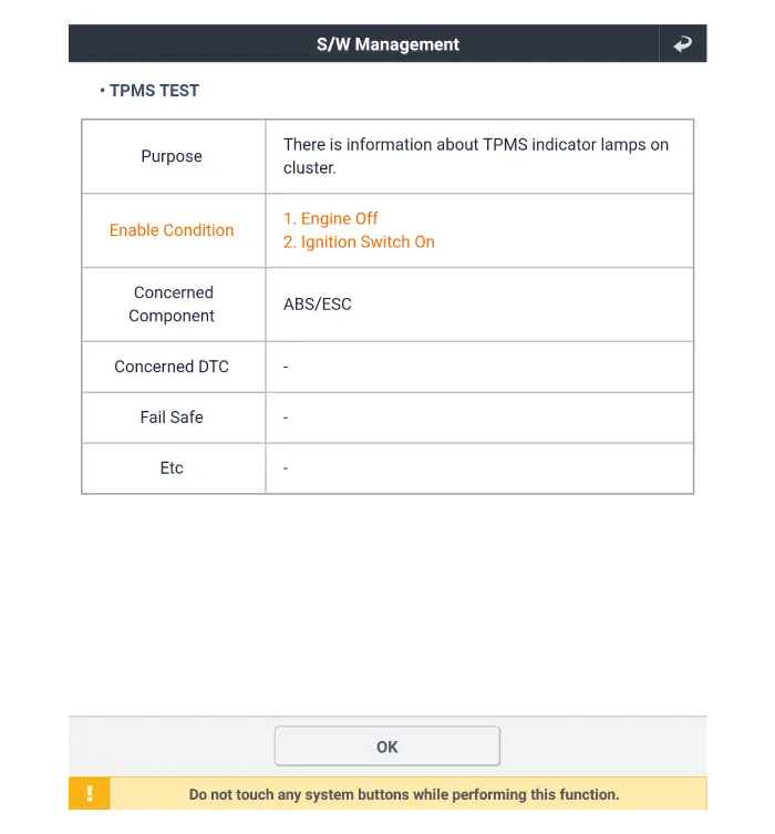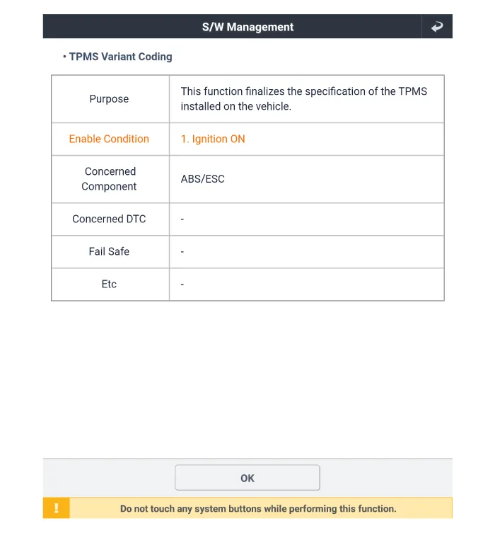 Select the "vehicle model" and "TPMS" on KDS vehicle selection screen, then select OK. [TPMS Variant Coding]