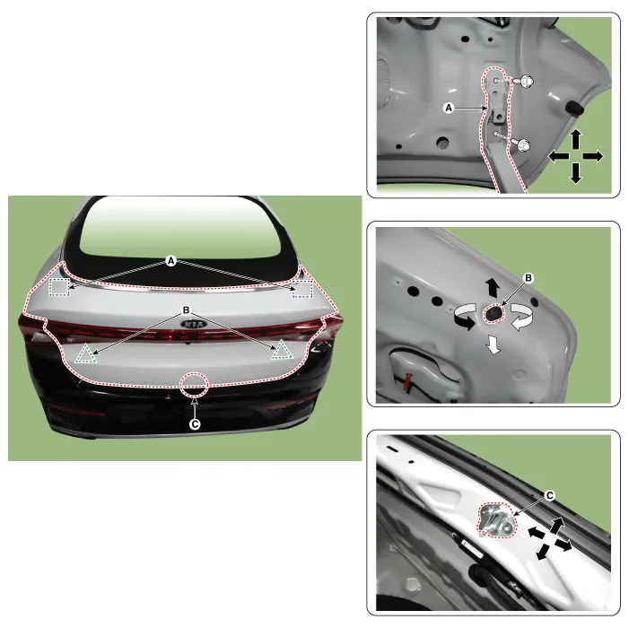 After loosening the trunk lid striker (C) mounting bolts, adjust the striker by moving it back and forth or from side to side and then tighten the mounting bolts. |