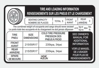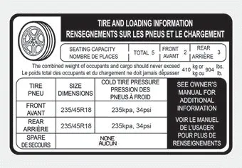 The label located on the driver's door sill gives the original tire size, cold tire pressures recommended for your vehicle, the number of people that can be in your vehicle and vehicle capacity weight.