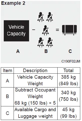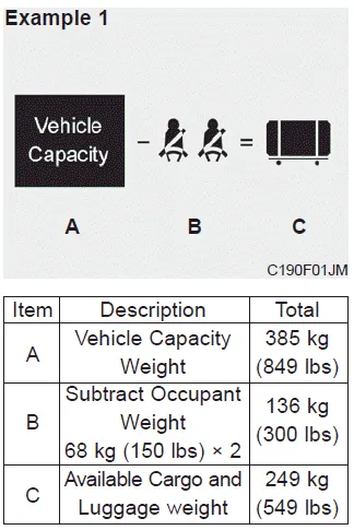 4. The resulting figure equals the available amount of cargo and luggage load capacity. For example, if the "XXX" amount equals 635 kg (1400 lbs.) and there will be five 68 kg (150 lb) passengers in your vehicle, the amount of available cargo and luggage load capacity is 295 kg (650 lbs).