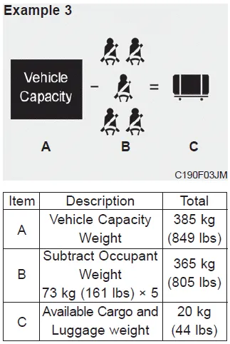 3. Subtract the combined weight of the driver and passengers from XXX kg or XXX lbs.