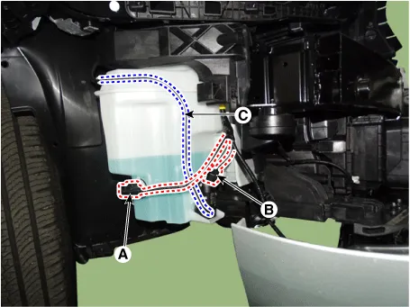 Disconnect the connector (B) and then remove the washer motor (C) after separating the nozzles (A).