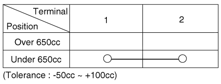 Check for continuity between the No. 1 and No.2 terminal in each float position. There should be continuity when the float is down. There should be no continuity when the float is up. |