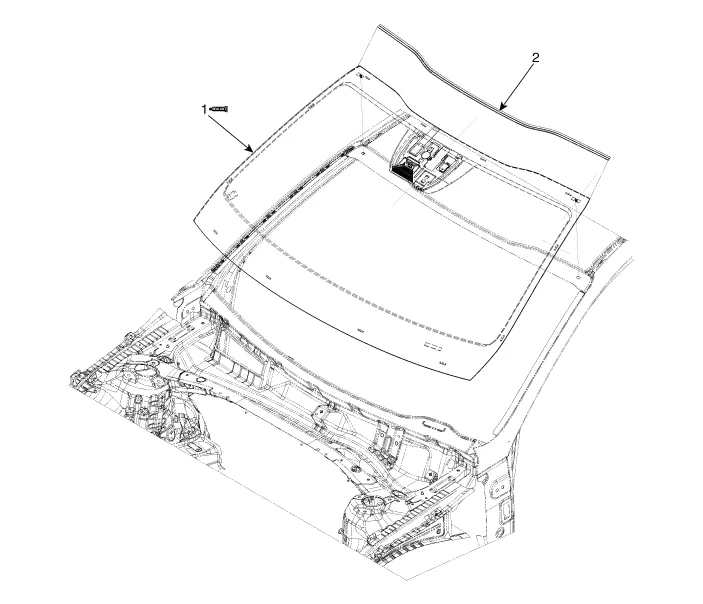 Components and components location Component Location 1. Rear window glass 2. Rear window glass molding Repair procedures Removal Put on gloves to prevent hand injuries.