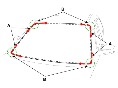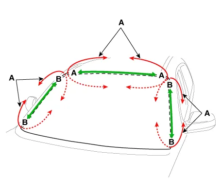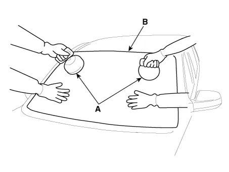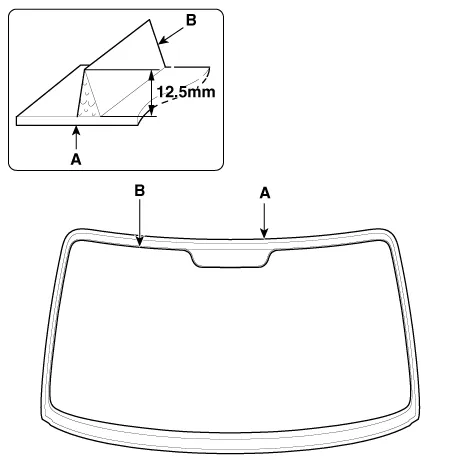 Apply a bead of sealant (B) around the windshield glass (A).