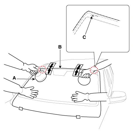 Using the glass holder (A), adjust the windshield glass (B) fit stopper to stopper hole (C) on the body and lightly push the windshield glass to make the edges fully seated on the bonding surface of body.