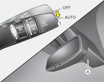 The rain sensor (A) located on the upper end of the windshield glass senses the amount of rainfall and controls the wiping cycle for the proper interval. The more it rains, the faster the wiper operates. When the rain stops, the wiper stops.