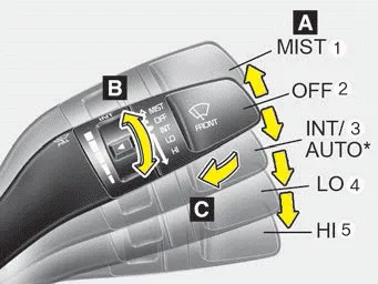 Operates as follows when the ignition switch is turned ON. MIST : For a single wiping cycle, move the lever to this (MIST) position and release it. The wipers will operate continuously if the lever is held in this position.
